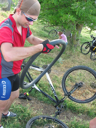 Все было бы не так интересно, если бы не аист Андрея. Как и ожидалось, педаль (точнее шатун) таки окончательно обиделся на своего владельца и решил совсем развалиться. Вообще функции-то свои он выполнял, но лишь частично. Т.е. шат вокруг вала составлял более 40 градусов, что делало езду на велосипеде возможной, но только на одной педали. Такое положение вещей нас не совсем устраивало и мы, уверенные, что в таком большом селе как Медведевка уж точно есть если не магазин по продаже запчастей к аистам, то хотя бы ларек такого плана, кинулись на поиски оного. Ларька такового не оказалось, и Андрей с Денисом начали методично расспрашивать местное население, у кого же есть вал каретки к столь распространенному в этих широтах транспорту. Как ни странно, но после получасового общения с аборигенами, вала обнаружит так и не удалось. А жаль.