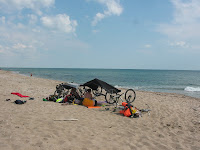 Солнце печет очень сильно, но нам на помощь уже в который раз приходят велочехлы-тенты. Ставим велосипеды и на них натягиваем тенты из двух велочехлов. Вода теплая, 23 градуса, но после купания так и не скажешь – очень сильный ветер, купаться некомфортно. Вода чистая, на пляже очень приятный песок. Решили не ехать, пока не спадет жара, поскольку все уже порядком обгорели на солнце.