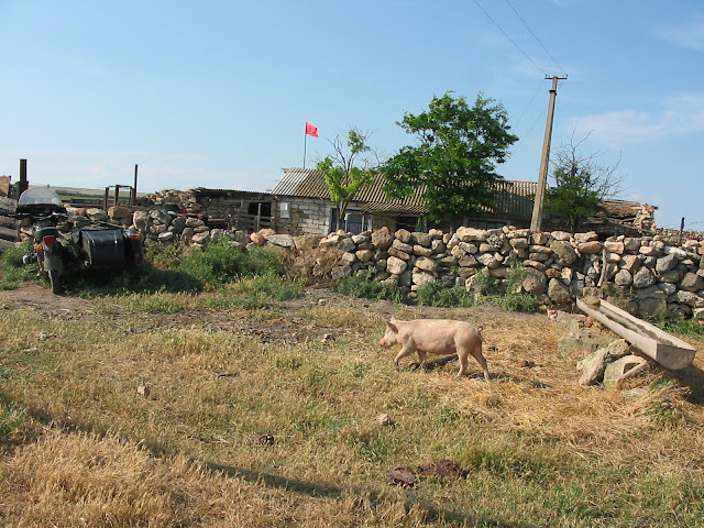 Перед Медведевкой проезжаем через какой-то интересный хутор – свиньи бегают себе вокруг, пасутся как гуси, рядом полуразрушенные дома. Виднеется только флаг СССР. Как-будто вернулись во времени лет на 20 назад.