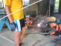 Нам сегодня по плану нужно проехать еще порядка 60 км. Были мысли починить велосипед собственными силами, но наших сил не хватило, аист победил. На подмогу было решено бросить сварочный аппарат, вероятность найти который, оказалось, была гораздо выше, чем запчасть. Итак, за минут 15 и 50 грн местный Вакула надежно прикрепил шатун к валу. Делов-то.