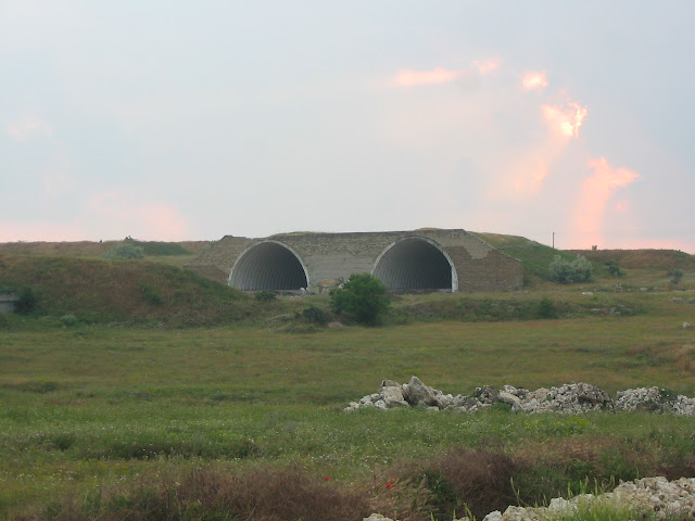 На окраине поселка нашему взору открылись здоровенные ангары, скрытые земляной насыпью. Скорее всего, здесь раньше стояли ЗРК С-200. Впечатляет.